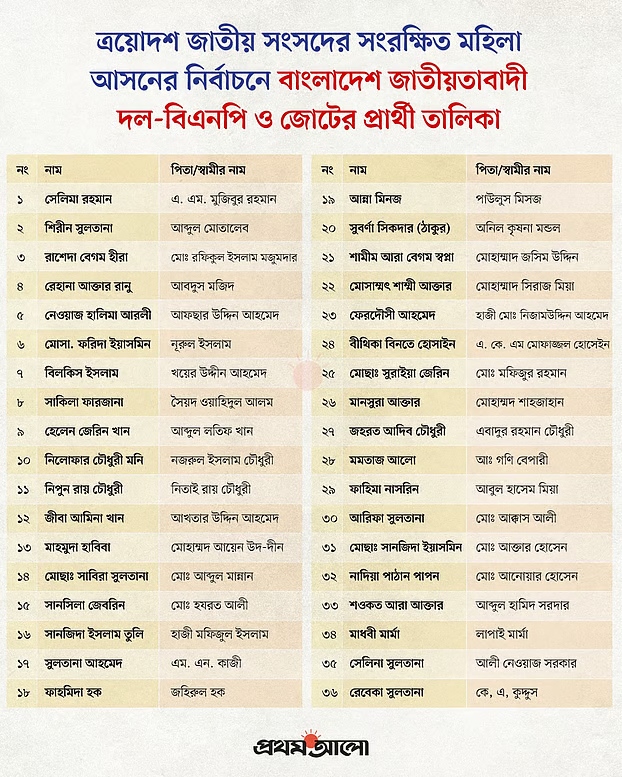 সংরক্ষিত নারী আসনে ৩৬ মনোনীত প্রার্থীর নাম জানাল বিএনপি, তাঁরা কারা